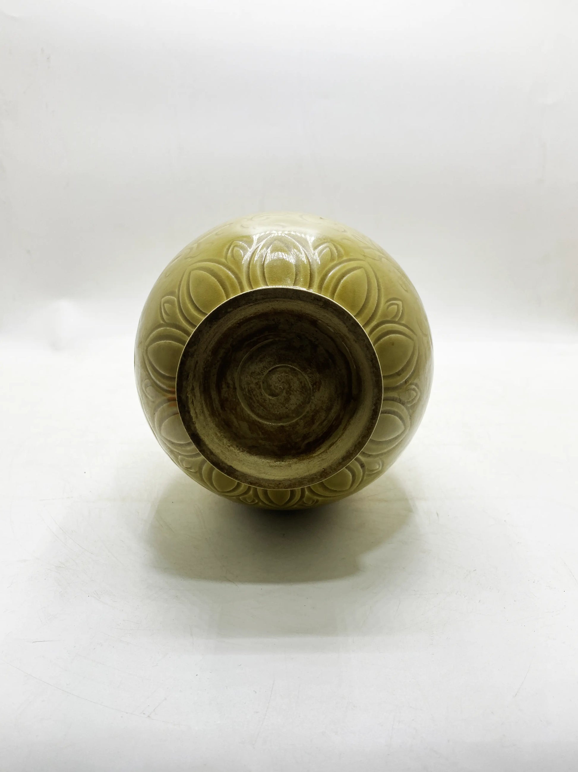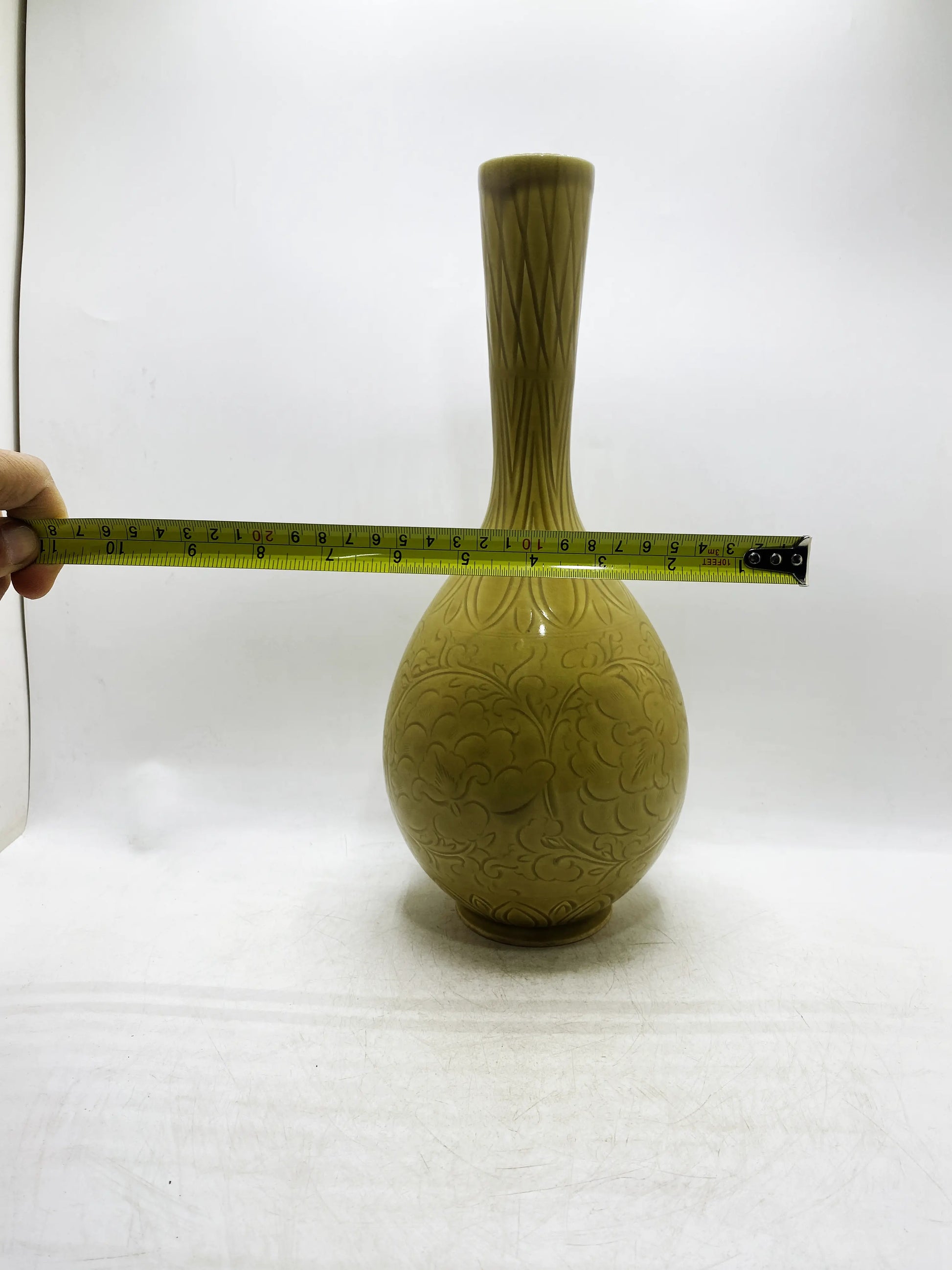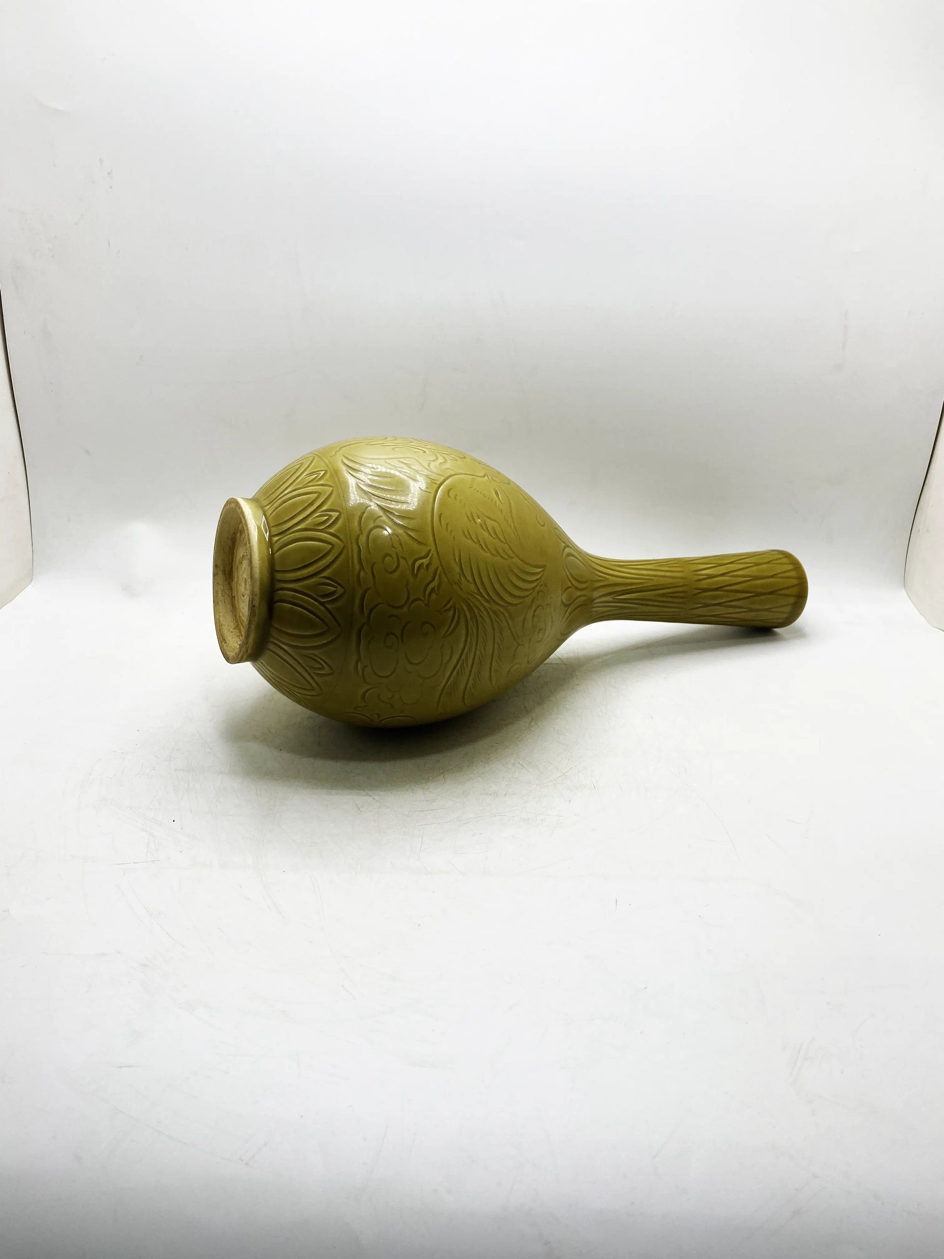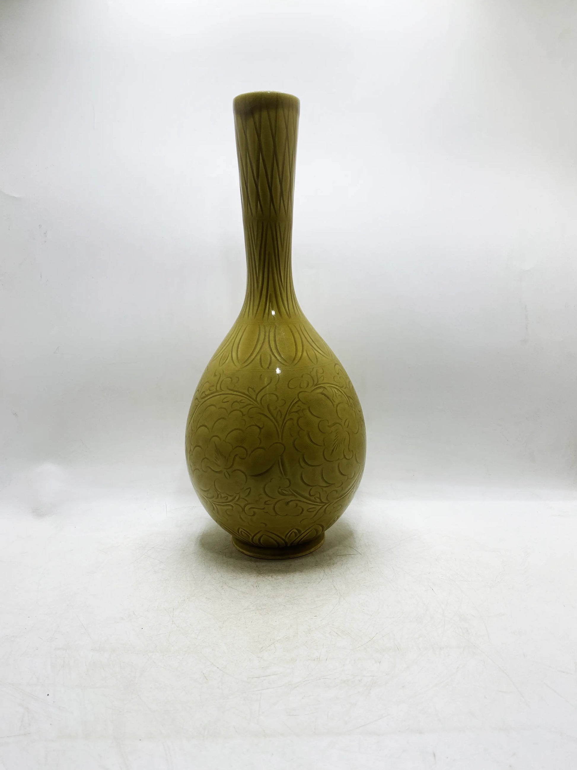 Handwerk & Material: Gelbe Glasur (Eisengelb bei niedriger Temperatur, warme Farbe), geschnitzte Dekoration (ineinander verschlungene Zweigmuster auf dem Bauch), feiner weißer Porzellankörper;