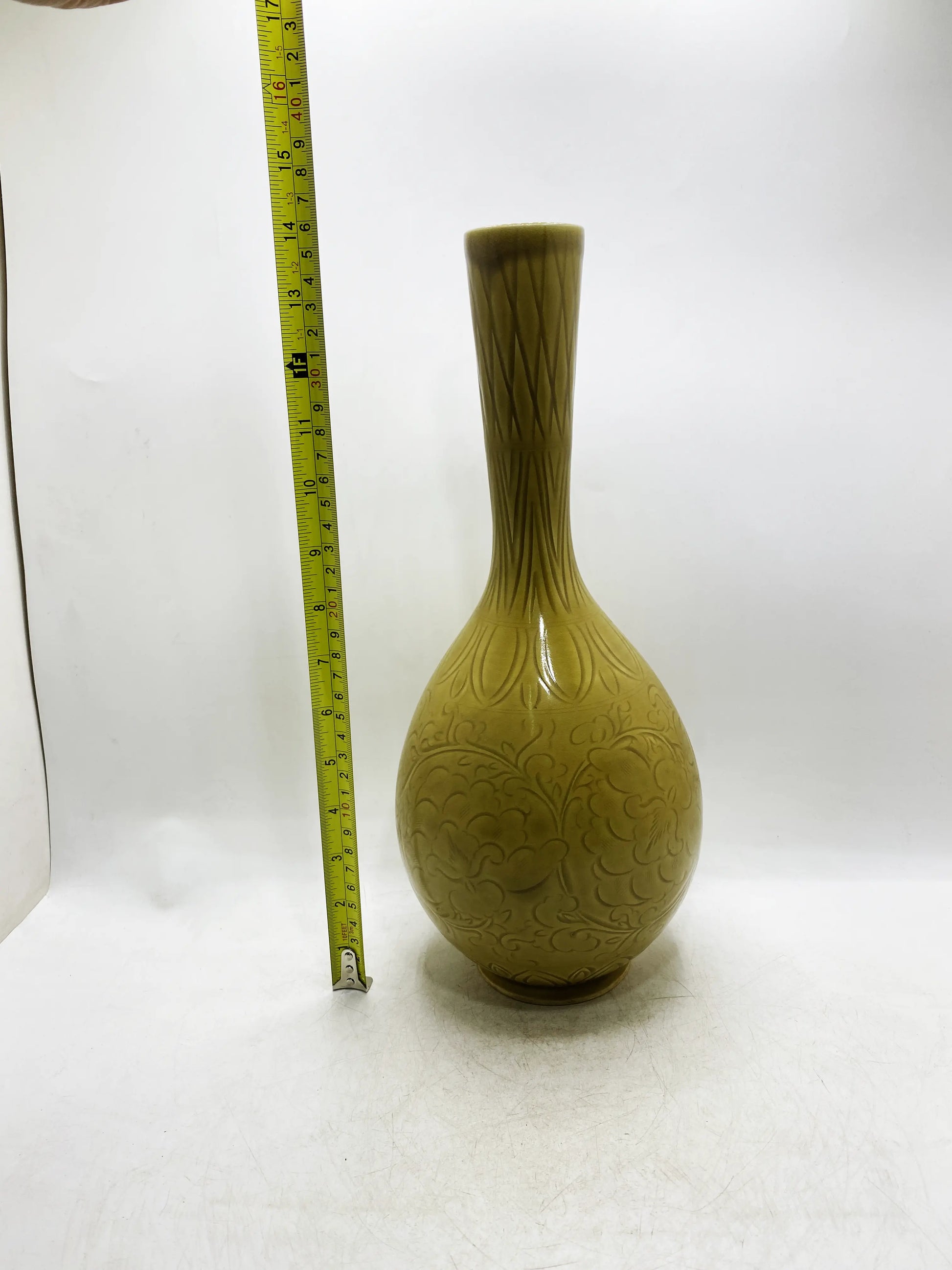Gelbglasierte, geschnitzte Langhalsvase aus der Qing-Dynastie