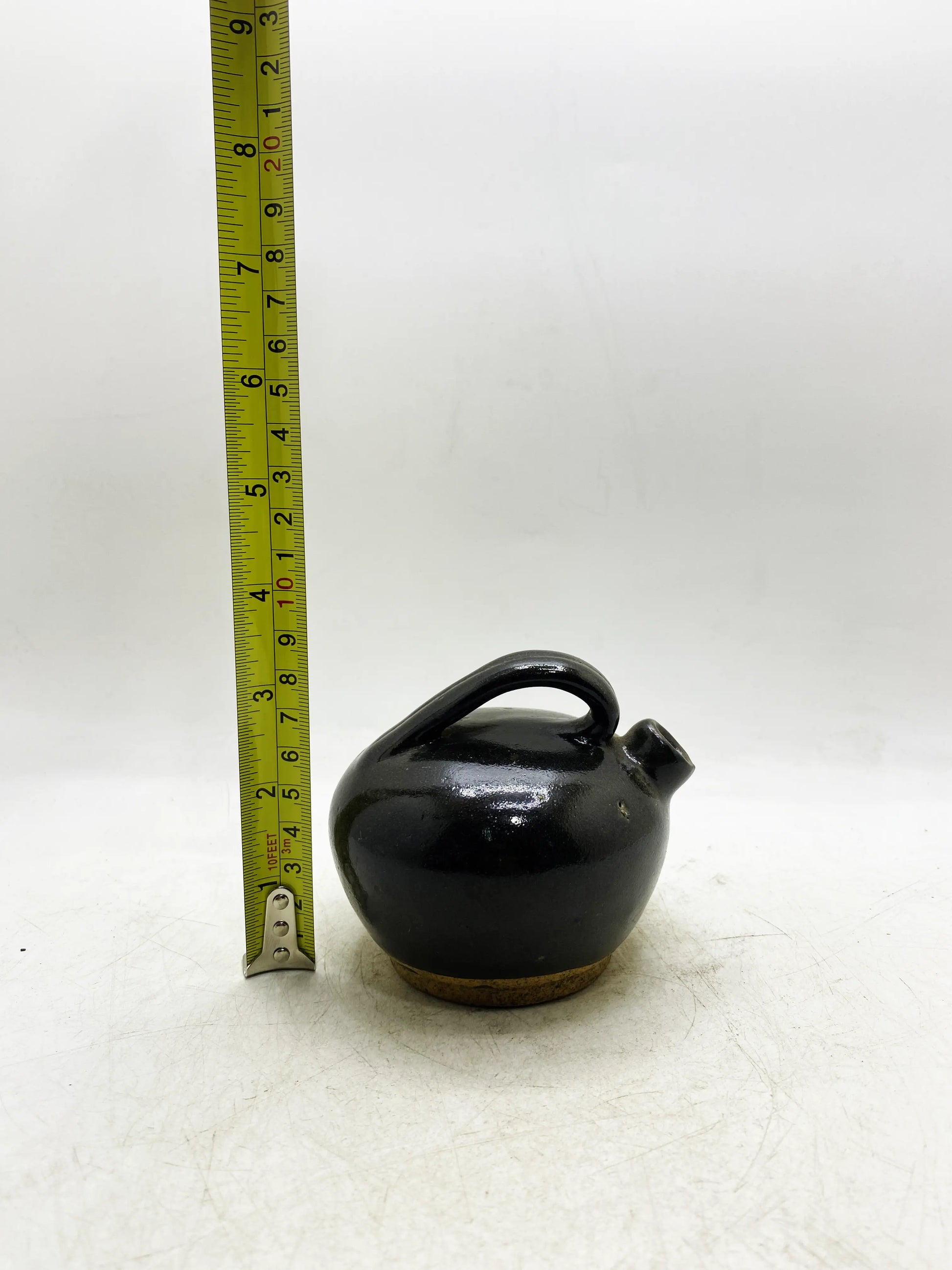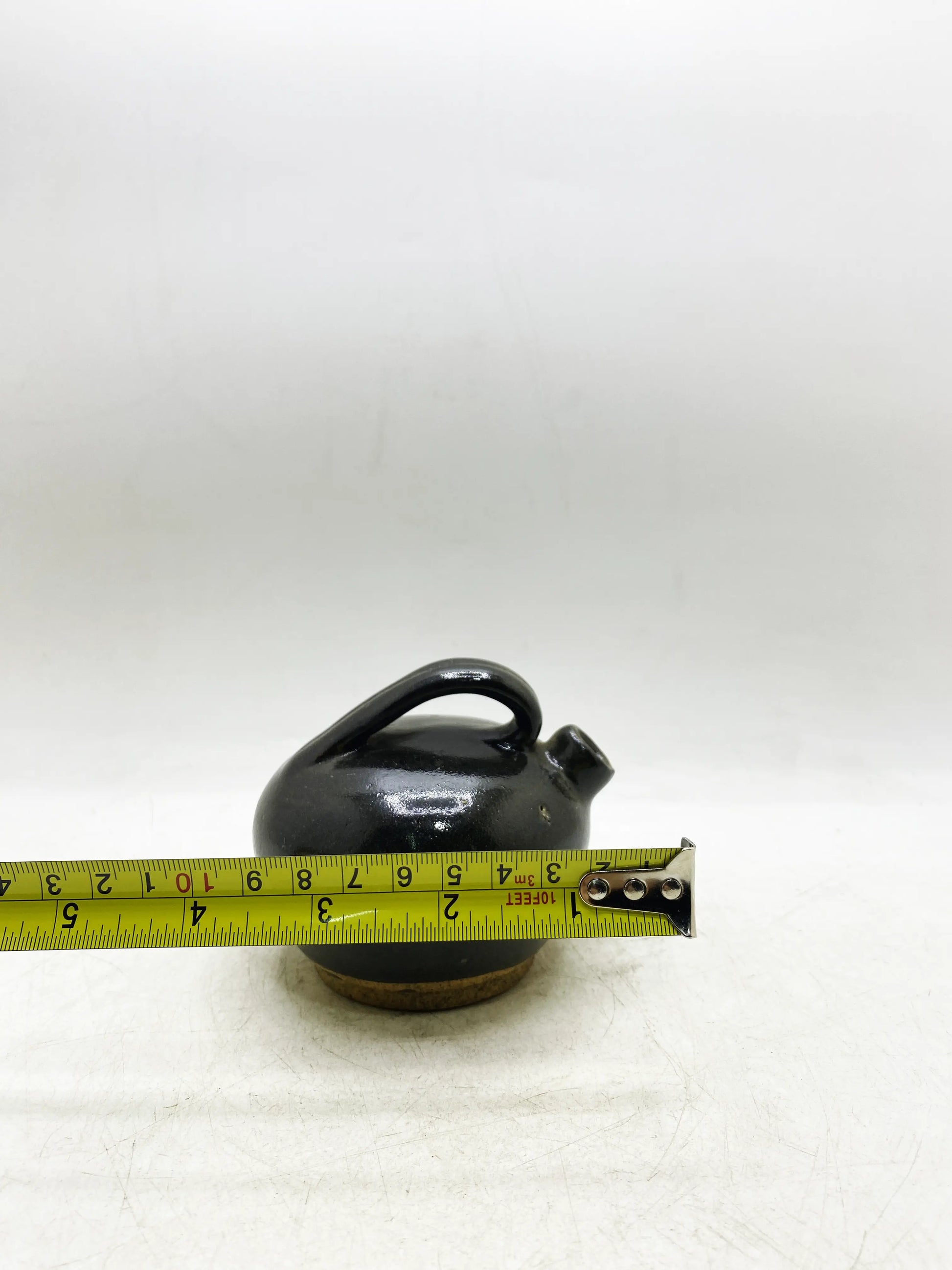 Handwerk & Material: Schwarze Glasur aus nordischen Brennöfen (tiefschwarz und glänzend, hoher Eisengehalt), beiger grober Körper, kleiner runder Bauch, kurzer Ausguss und gebogener Griff;